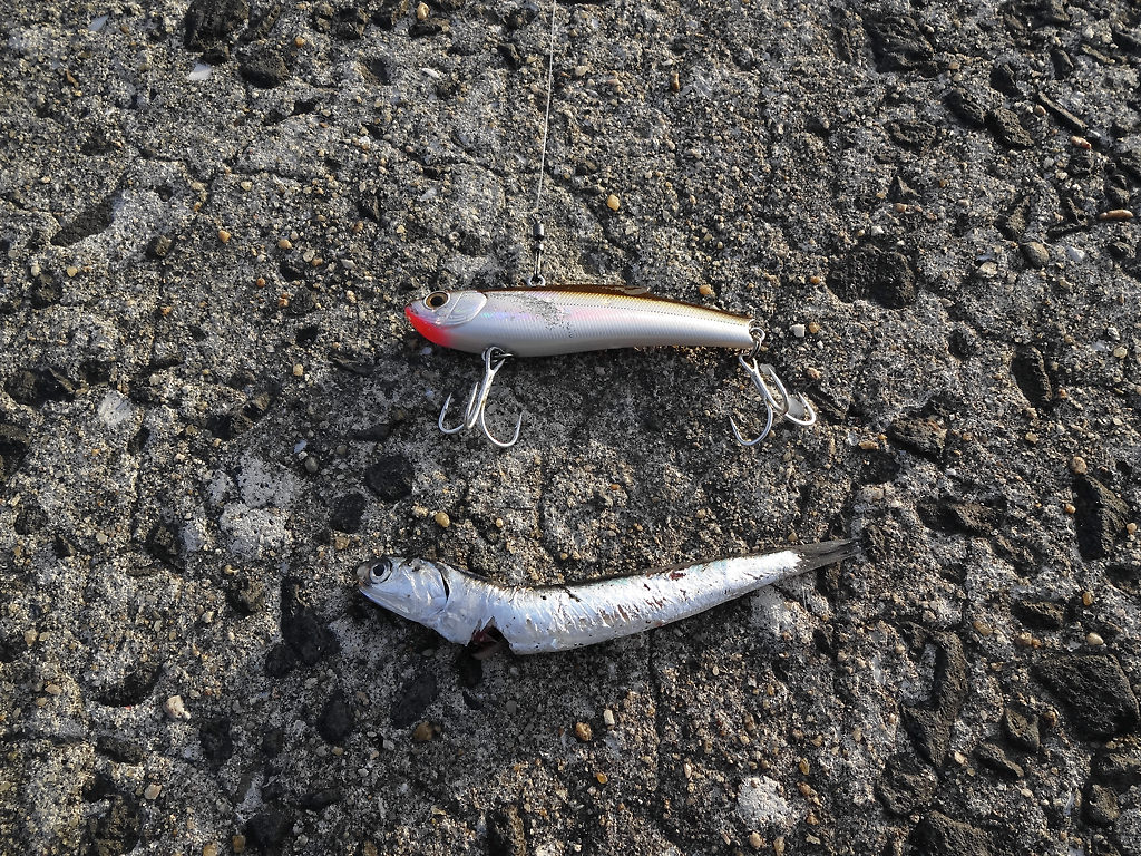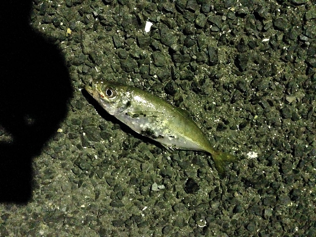 これはもう朝マズメのシーバス君に期待するしかない!!と車の中で仮眠・・・辺りが明るくなり始める頃に起床。さぁ!釣り開始!!釣り開始からまもなく、筒井君がなかなかいいサイズの蒲鉾君をキャッチ。蒲鉾君が吐き出したベイトは・・・